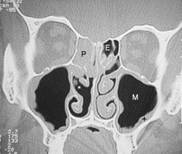 Erklärung: Schwarz: Luft, Graustufen: Weichteile, Weiß: Knochen, IT: untere Nasenmuschel, M: Kieferhöhle, S: Nasenscheidewand