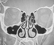 Erklärung: Schwarz: Luft, Graustufen: Weichteile, Weiß: Knochen, IT: untere Nasenmuschel, M: Kieferhöhle, S: Nasenscheidewand